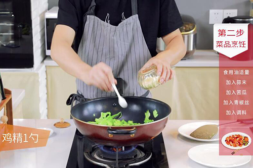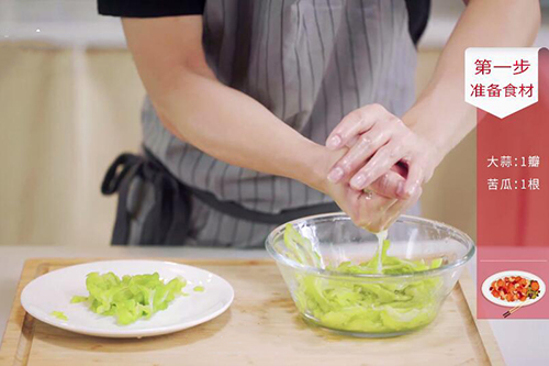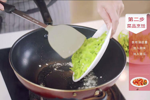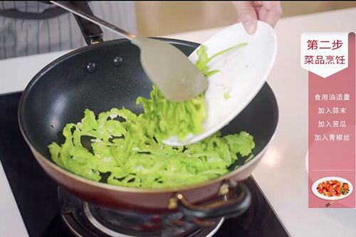 5.锅内放入适量油,油温烧至七成热,放入苦瓜炒至断生;
