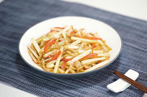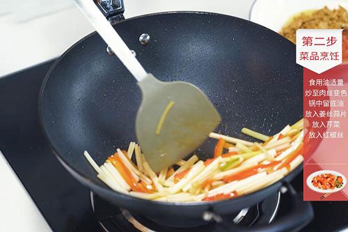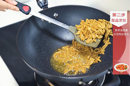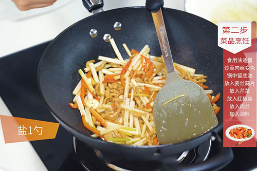 5.加入切好的肉丝翻炒均匀,调入盐1勺、鸡精半勺即可。