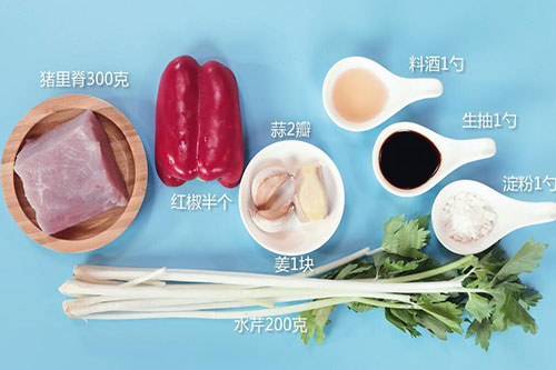 水芹200克,猪里脊300克,红椒半个;
