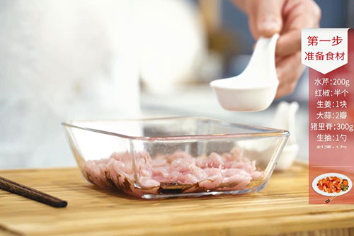 2.猪里脊洗净,切片后改刀切丝,加入生抽1勺、料酒1勺、淀粉1勺拌匀后腌制10分钟;