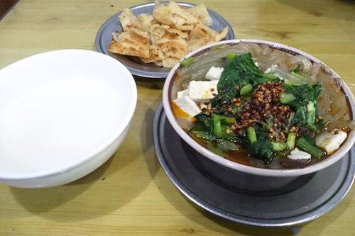 扁粉菜是安阳人最爱的一种食物,也是安阳特色菜之一。这道小吃很多地方都能吃到,不管是小摊还是大餐厅都有,价格比较实惠,但是味道很丰富。扁粉菜以粉条做主料,配上了青菜、豆腐、猪血等,用高汤在一口大铁锅中煮一煮,高汤味道很重要,扁粉菜油滚滚、香喷喷、辣呼呼的,一定要吃。