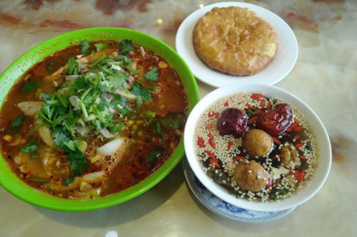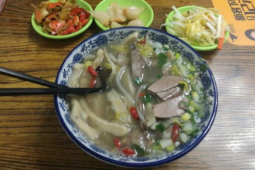 烩羊杂碎是银川名吃,也是一道传统小吃,很多人都知道,来银川的人都会来尝一尝。烩羊杂碎的口感绵软爽口,味道鲜美,它的做法很讲究,吃法也很多样,用到了羊的五脏六腑和头、蹄子,风味独特,杂碎丝浇上原汤,加葱、姜、蒜末、红辣油、香菜等。