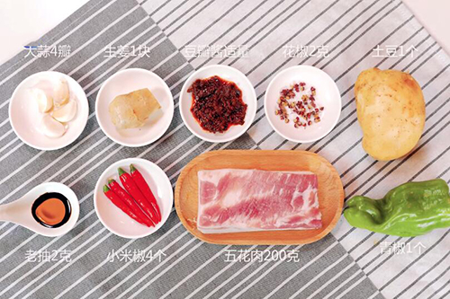 主料:五花肉200克,土豆1个,青椒1个,小米椒4个;