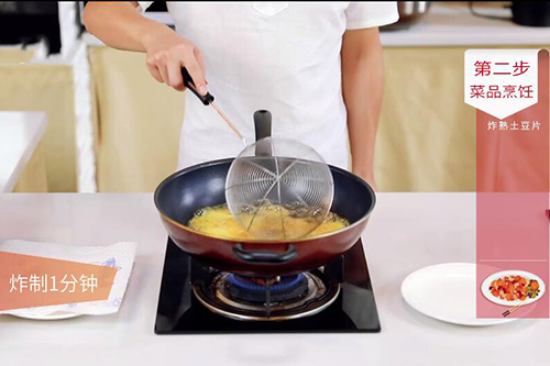 3.锅中放入适量,油温烧至6成热,放入土豆片炸制1分钟,捞出沥干;