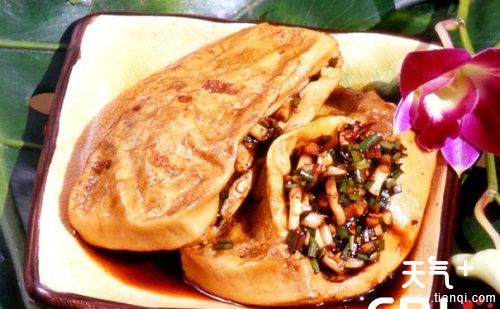烤豆腐果在贵阳人中被戏称为“恋爱豆腐果”,将豆腐果放在带有小孔的铁盘上,用小铲不断翻动烤煎,烤到表面黄亮鼓起时,用竹片将豆腐果当腰剖开,加入辣椒、蒜、酱油等佐料,咸辣嫩烫,满口喷香,滋味非常诱人。一般在贵阳各小吃街上、农贸市场均有售。