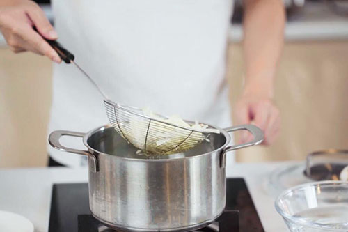 4.锅中放入适量水烧开,放入土豆丝焯水,捞出放入凉水中,再沥干水分;