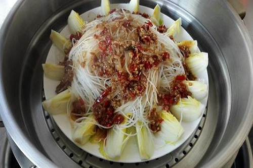 8、摆盘,每瓣菜间隔中填上蒜末,中心铺上粉丝,开水入锅蒸5分钟;