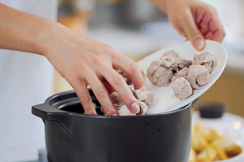 6.将排骨、猴头菇、姜片依次放入锅中;
