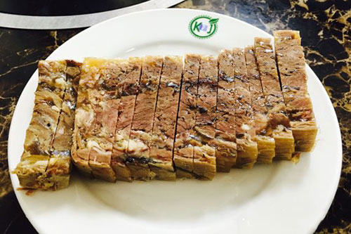 酱方是外观精致,属于苏菜系,酱方的口感咸中带甜,吃起来香而不腻,入口即化,很有苏帮菜的特色风味。酱方是用五花肉作为主料做成的一道苏州名菜,底下是菜叶,配上各种酱汁,好看又好吃。