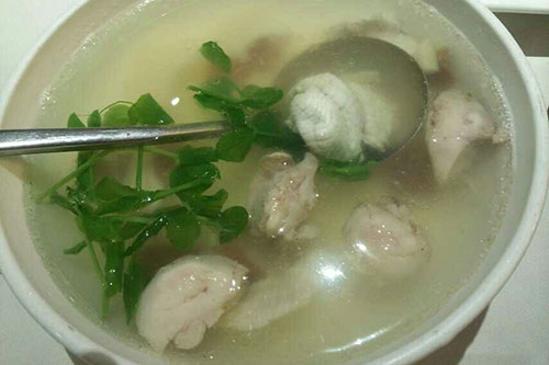 鲃肺汤是一道夏秋季节非常受欢迎的苏州名菜,这也是一掉时令菜,用到了活鲃鱼作为主料,配上了火腿,香菇片,春笋片等等,汤清味美,鱼肉鲜嫩,非常好喝。