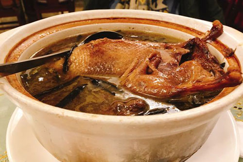 母油船鸭是地方菜肴,也是苏州的名菜,这道菜历史悠久,当年太湖游船众多,船家在船上做饭烧菜,用整只鸭子煨制成一道香浓的汤,肉质酥烂,非常受欢迎,这道菜就取名叫做母油船鸭,已经流行百年了。