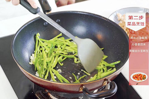 4.锅中留底油,放入姜蒜末炒香,放入青椒丝炒至断生;