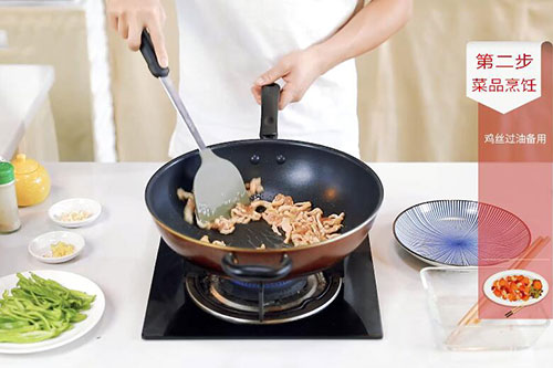3.锅中放入适量油,油温烧至7成热,放入鸡肉丝炒至变色,捞出待用;