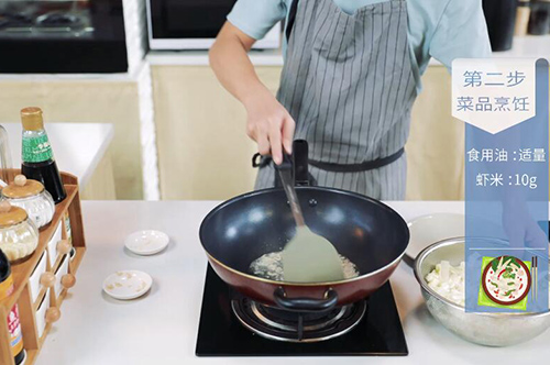 3.锅内放入适量油,油温烧至七成热,放入姜末炒香,放入虾米翻炒几下;