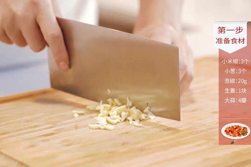 1.泡椒20克切碎,小米椒3个切圈,姜1块切片,蒜4瓣切末,葱3根切段;