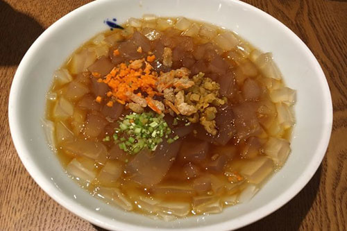 海菜凉粉是青岛的名吃,选用正宗本地石花菜,经过了凉晒过细,水煮,精心过滤制作而成,配上了10多种调味和 辅料,具有鲜、辣酸、嫩,入口即化的独特风味。吃起来非常爽口。