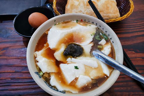 老青岛人喜欢吃豆花,其实就是豆腐脑,豆腐脑也是青岛人最喜欢的特色早点之一,一份传统的豆花,虾皮、咸菜、卤汤,一样都不能少。满满一大碗飘散着淡淡的豆香,入口嫩滑清口。