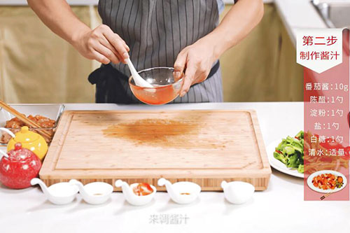 3.调酱汁:番茄酱10克、盐1勺、糖1勺、醋1勺、淀粉1勺、清水适量;