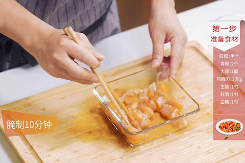 2.鸡胸肉洗净切丁,放入生抽1勺、料酒1勺、白糖1勺拌匀后腌制10分钟,腌制好后放入1勺淀粉拌匀;