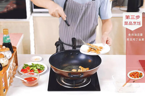 4.锅内放入适量油,油温烧至7成热,放入鸡丁煎制,煎至鸡丁表面金黄捞出;