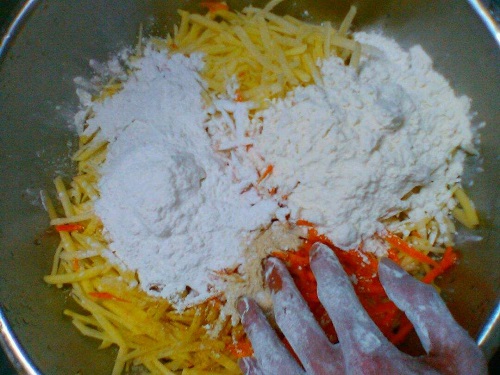 3、放入的面粉要适量,一般土豆丝和面粉只要能粘合在一起即可;