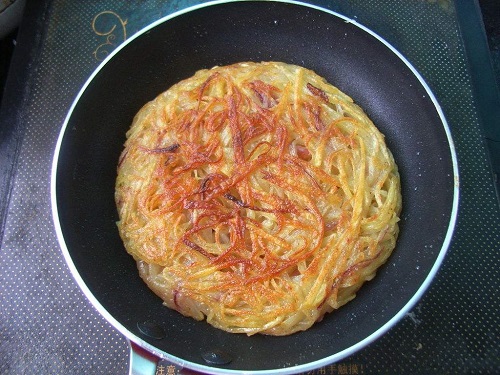 5、将土豆丝饼摊平,煎至金黄色之后,翻面;