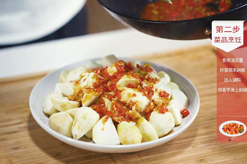 3.将炒好的剁椒倒在香芋上;