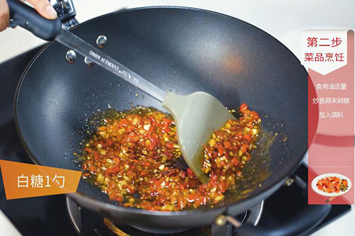 2.锅中放入适量油,油温烧至7成热,放入蒜末,剁椒炒香,加入生抽1勺,耗油半勺,白糖1勺炒匀;