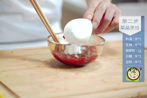 4.牛肉中放入生抽半勺、料酒半勺、糖半勺、胡椒粉1克往一个方向搅拌;