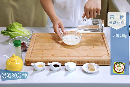 6.锅中放入适量清水大火烧开,将米放入锅中,大火煮开后转小火熬煮25分钟,期间不定时搅拌,防止粘底;