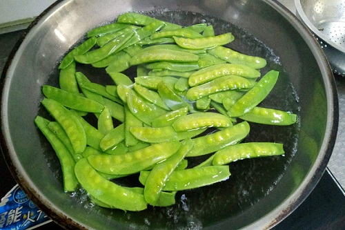 2、热水烧开,倒入荷兰豆,煮2-3分钟,捞出来,过冷水,淋干水备用。