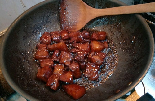 4、倒入酱油翻炒,炒到黄酒挥发,酱油均匀的吸附在肉块上为止;