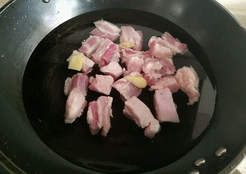 1、先把五花肉切成2.5厘米见方的块儿,凉水下锅,水开后把肉块儿煮5分钟,捞出,控净水份备用;