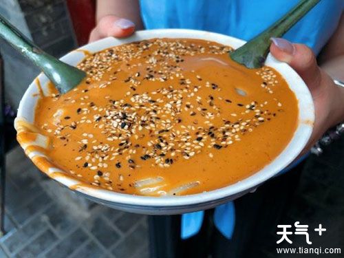老北京面茶在北京是很接地气的一道特色小吃,一般在下午售卖。有诗云:“午梦初醒热面茶,干姜麻酱总须加。”喝面茶很讲究吃法,吃时不用筷、勺等餐具,而是一手端碗沿着碗边转圈喝,非老北京人恐怕无此吃法。面食面茶不是茶汤,是黍子面或小米面煮成的糊状物,表面淋上芝麻酱,芝麻酱要提起来拉成丝状转着圈地浇在面茶上。
