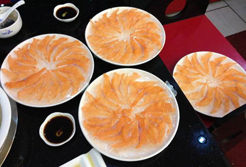 丽江三文鱼和我们知道的一般的三文鱼可不同,丽江三文鱼生长在玉龙雪山冰川融水里面,吃的是小鱼小虾,所以不管是肉质还是营养都更好。丽江三文鱼习惯“一鱼三吃”,有三文鱼刺身,头尾连骨肉下火锅,鱼皮干炸下酒。