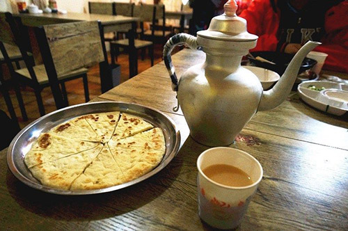 丽江人喜欢喝酥油茶,这也是丽江人日常的一种茶饮。酥油茶是用酥油和浓茶加工制作而成,将酥油放进桶里面,拌上盐,再加入浓茶汁,用木柄反复搅拌,让素有和浓茶融合,呈现乳状既可以了,丽江酥油茶一般喝水焖粑粑一起吃,还可以搭配炒洋芋,或者是一份鸡豆凉粉,这是纳西人最喜欢的搭配。