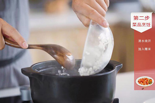 3.锅中放入适量清水烧开,放入糯米大火煮开后转小火熬煮30分钟,期间不定时搅拌,防止糊锅;