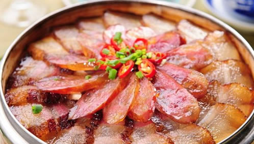 做法:将腊肉解切成均匀的片,焯水待用。锅内放水,下入葱、姜、料酒,下鳅鱼焯水捞出。将腊肉和鳅鱼拼摆在扣碗内。锅内放油,将干椒、豆豉炒香,放入调料,然后浇在扣碗内,上笼蒸约30分钟,出笼后反扣在盘中即成。