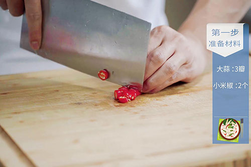 1.蒜3瓣切末,小米椒2个切圈;