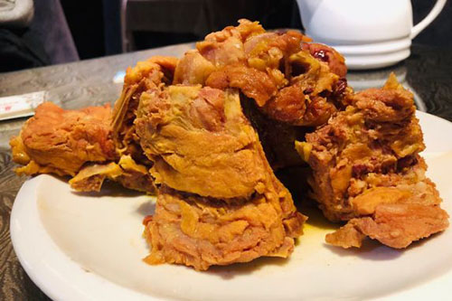 锅包肉是一道东北名菜,据说至今已经有上百年的历史了。它的做法比较讲究,做出正宗的口味并不容易,牡丹江小吃当然少不了锅包肉,将猪里脊肉切片腌入味,裹上炸浆下锅炸至金黄色捞起,再下锅拌炒勾芡即成。成菜金黄,外酥里嫩,酸甜可口,非常好吃,香而不腻。