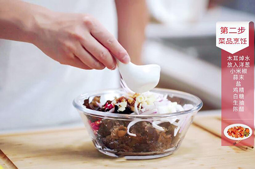 7.放入洋葱丝、凉拌木耳的做法 凉拌木耳怎么做好吃蒜末、小米椒段、盐半勺、鸡精半勺、生抽半勺、醋1勺,香油5克、白糖5克拌匀即可