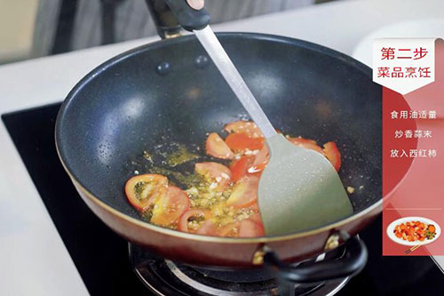 2.锅内放入适量油,油温烧至七成热,放入蒜末炒香后放入西红柿炒出汁;