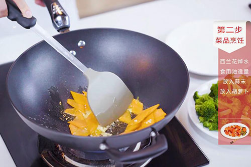 4.锅中放入适量油,油温烧至7成热,放入蒜末炒香,放入胡萝卜炒至断生;