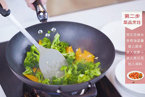 5.放入西兰花继续翻炒,放入盐半勺、鸡精半勺拌匀即可。