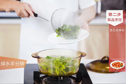 3.锅中放入适量水烧开,放入西兰花焯水半分钟后捞出待用;