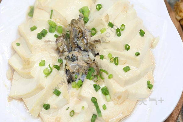 3.豆腐切片,摆入盘中。腌好的牡蛎铺在豆腐中间,淋上调料汁,放入锅中蒸制8分钟,出锅撒上葱花即可。
