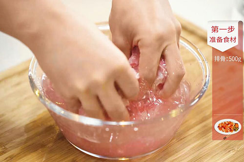 1.排骨中放入盐1勺、白醋半勺、清水适量。抓洗干净后沥干水分;