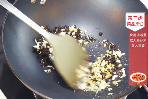 3.锅中放入适量油,油温烧至7成热,放入姜蒜末、豆豉碎炒香。盛出待用;