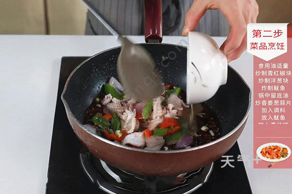 3.锅中留底油,放入姜葱蒜片炒香,放入大酱1勺、甜面酱半勺、料酒1勺炒匀,加入酱油1勺、白糖1勺、鸡精半勺少许,放入鱿鱼、青红椒、洋葱翻炒均匀即可出锅。