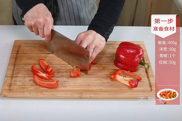 1.鱿鱼洗净切花刀,洋葱块切,青红椒切块,姜葱蒜切片。